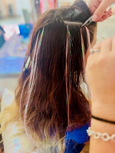 Add a touch of magic with shimmering, temporary strands woven or clamped into your hair, perfect for any occasion.